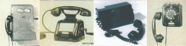(从左至右:我国第一部磁石电话机,“大方磁” 电话机,便携式电话机,壁挂式自动电话机)